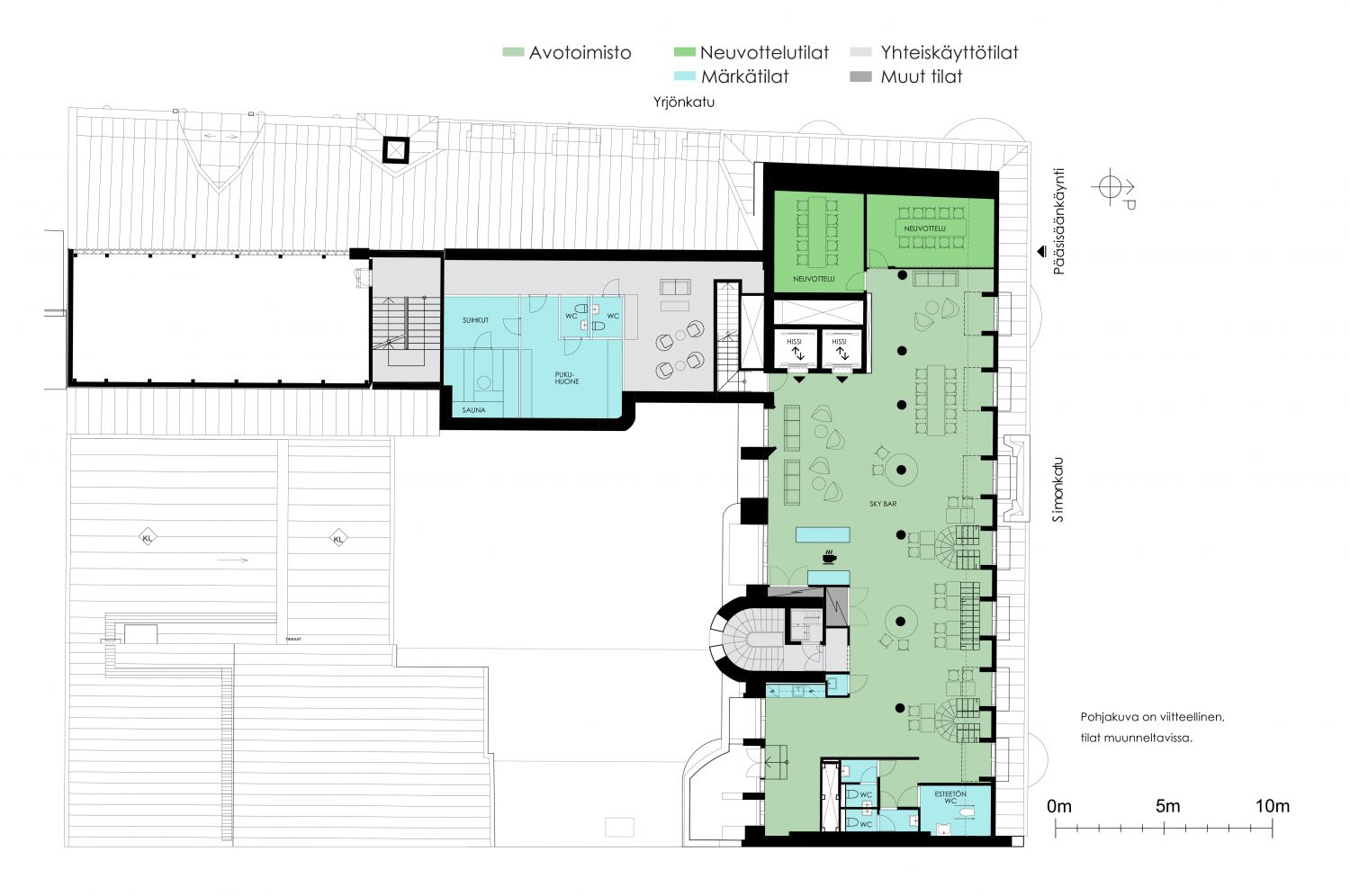8. kerrokseen on suunniteltu esimerkiksi lounge-tilaa, kokoushuoneita sekä saunatilat. Kerroksesta on upeat näkymät Narinkkatorin yli Töölönlahden suuntaan. Tilaratkaisut toteutetaan toiveiden mukaan.
