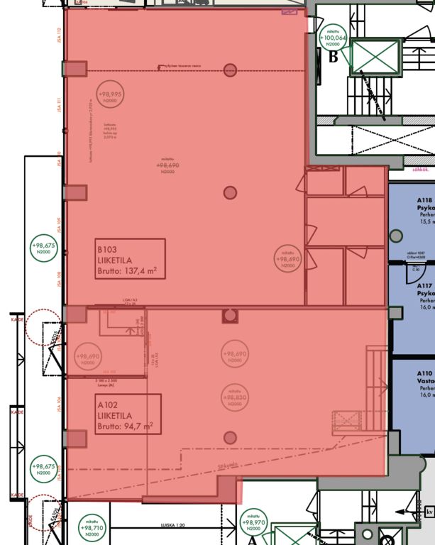 Tämä 231 m² liiketila sijaitsee kiinteistön katutasossa. Tilaan on sisäänkäynti suoraan kadulta, Aleksanterinkadun puolelta. Liiketila on mahdollista jakaa kahdelle käyttäjälle 136 m² ja 95 m² kokoisiin osiin. Tämä tila ei sovellu ravintola-, kahvila- tai parturi-kampaamotoimintaan, This premise is not suitable for a restaurant, cafeteria or a barber shop.