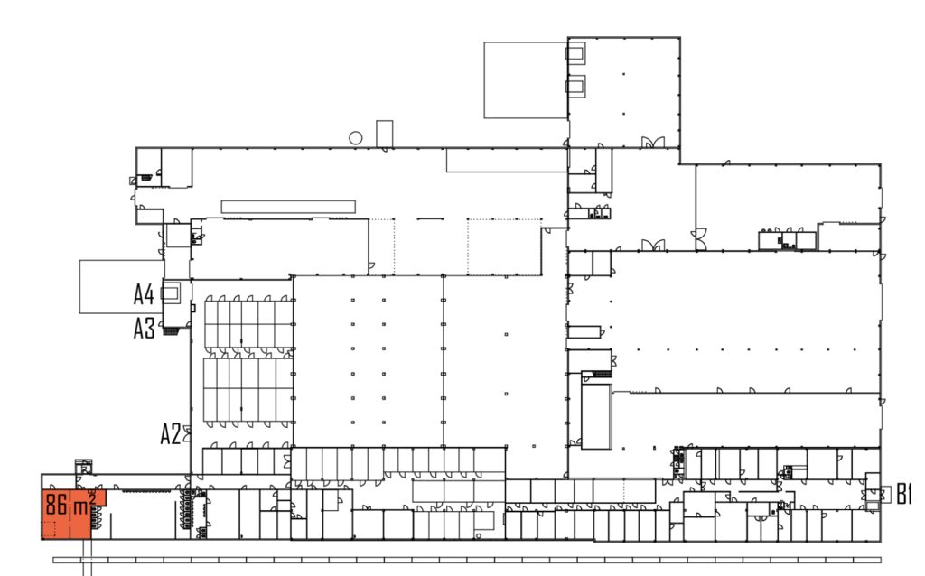 Tämä 86 m² tuotantotila sijaitsee kiinteistön katutasossa. Tila on korkeudeltaan kaksiosainen. Korkea osa nosto-oven kohdalla on 3,9 m korkeaa. 5 metrin päässä nosto-ovesta alkaa matala osa, jonka korkeus on 2,3 m. Matalan ja korkean osan välissä on 2 m korkeudelle katosta laskeutuva väliseinä. Nosto-oven koko: leveys 260 cm, korkeus 250 cm. Nosto-oven alareuna on lattiatasolla eli n. 35 cm pihaa ylempänä.