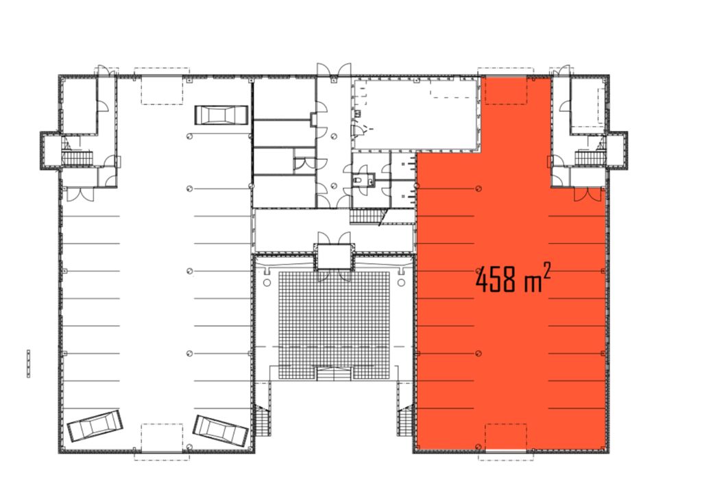 Tämä 458m2 varastotila sijaitsee kiinteistön katutasossa, ja se on läpiajettava. Tilan molemmissa päädyissä on 3,60m x 2,40m kokoinen nosto-ovi. Varasto ei sovellu autopesulaksi. Kiinteistöstä on mahdollista vuokrata myös toimistotilaa.