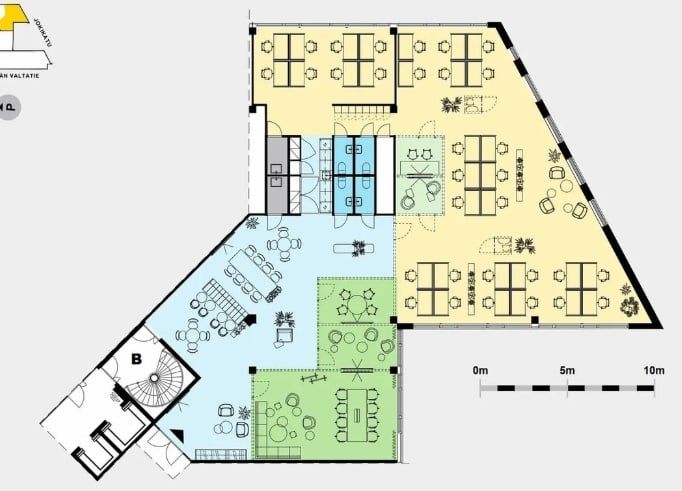 Vuokrattavissa ensimmäisessä kerroksessa sijaitseva toimistotila. Tilassa voidaan tehdä muutoksia asiakkaan tarpeiden mukaan, ja pohjakuva tarjoaa esimerkin mahdollisesta tilasovituksesta. Tila on muuntojoustavaa, ja siinä on jäähdytys sekä energiatehokas LED-valaistus.