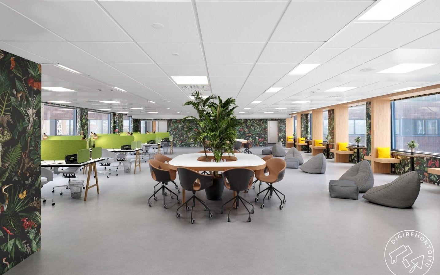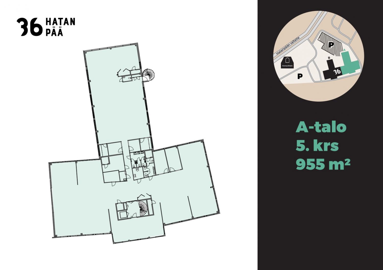Vuokrattavana suuri toimistotila viidennessä kerroksessa. Tilan kokonaispinta-ala on 955 m², ja se on mahdollista jakaa esimerkiksi seuraaviin osiin: 433 m², 306 m² ja 245 m² kokoisiksi erillisiksi toimistoiksi. Tilakoosta riippuen tilassa on joko yhteiskäyttöiset tai omat wc-tilat kerroksen muiden käyttäjien kanssa. Tilat ovat modernit ja toimistosta on mahdollista saada toimiva monelle eri yritykselle.