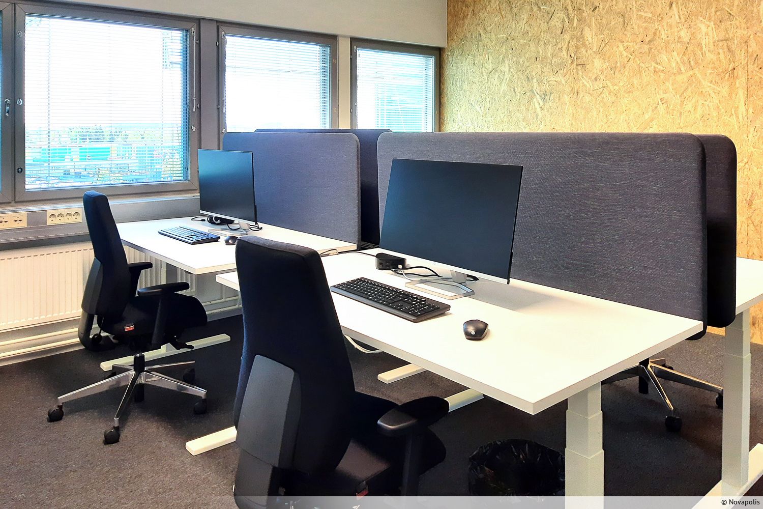Työpisteen varusteluihin kuuluu sähköpöytä, toimistotuoli, sermit, iso näyttö, telakka, hiiri ja näppäimistö. Lisäksi käytössäsi on WiFi ja lukittava lokero.