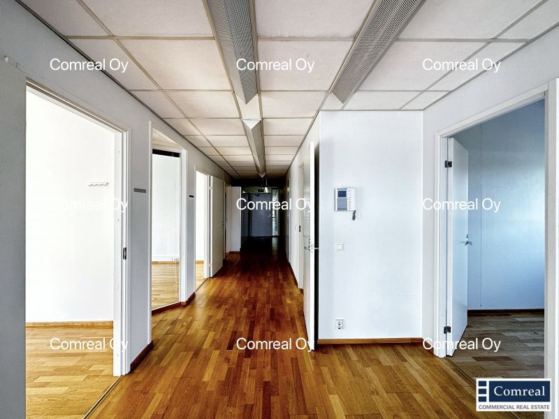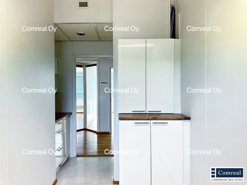 Näyttävä toimistotila jossa on eteinen, 6 kpl toimistohuoneita, keittiö, taukotila ja wc.