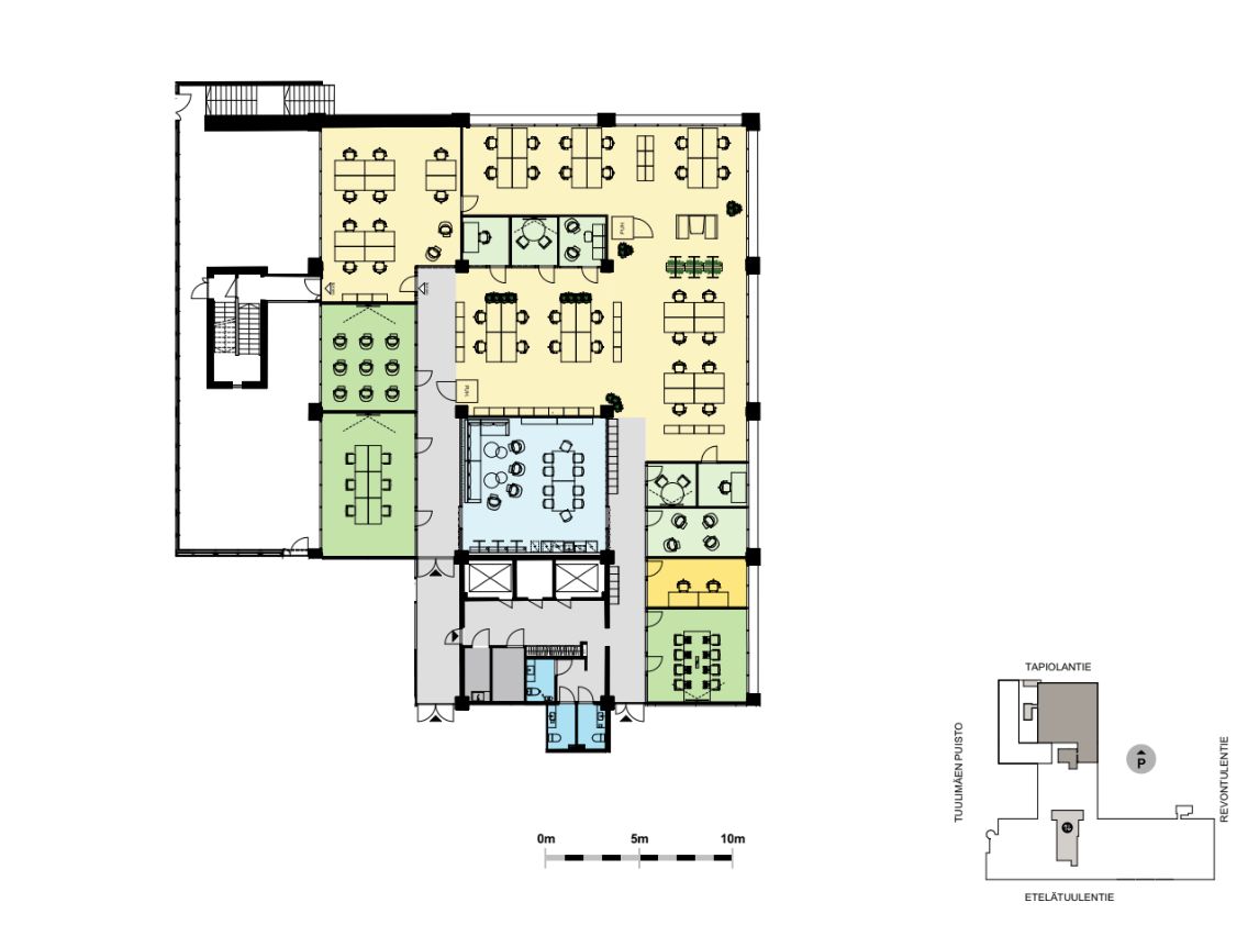 Valoisa, suurilla ikkunoilla kolmeen ilmansuuntaan varustettu monipuolinen toimistotila joka sopii hybridityöskentelyyn. Tilassa 2 isoa neuvotteluhuonetta, 5 vetäytymistilaa ,2 toimistohuonetta ja cafe/lounge tila kohtaamisille. Tila on muuttovalmis ja tarvittaessa yhdistettävissä viereiseen 361,5m2 tilaan.