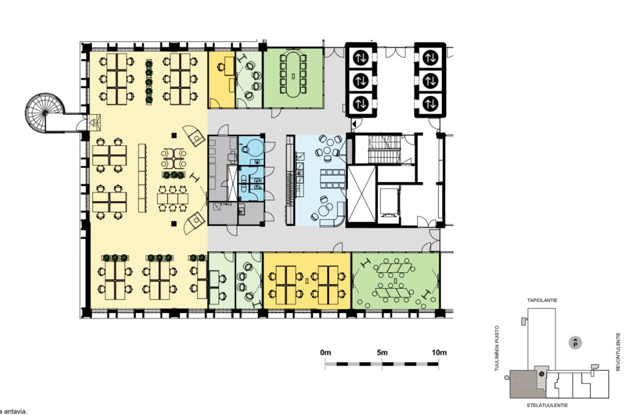Valoisa päätytoimisto jossa ikkuvat kolmeen ilmansuuntaan. Näkymät tilasta puiston suuntaan. Ikkunoista näkyvät isot männyt ihastuttavat! Tilassa 2 neuvotteluhuonetta ja 3 vetäytymistilaa ja rauhallinen cafe/lounge. Tilaan mahdollisuus rakentaa myös toimistohuoneita.