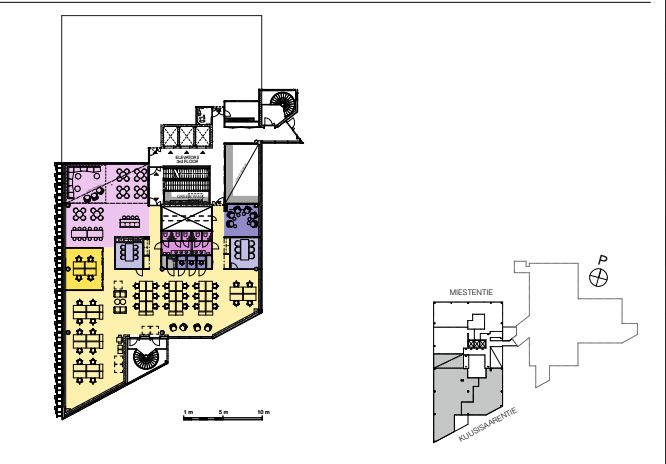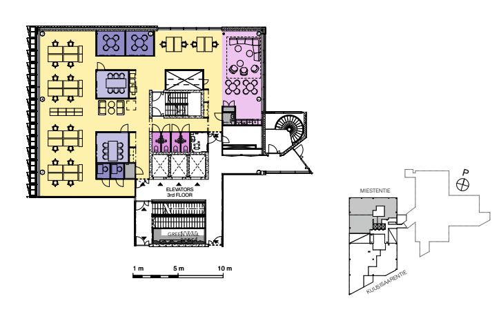 Tästä monitilatyöympäristöstä avautuu ikkunat kolmeen suuntaan. Koko kerros on n. 900 m2, josta tila jaettu,ikkunat neljään suuntaan. 3. kerros on myös mahdollista jakaa kahteen eri tilakokonaisuuteen.