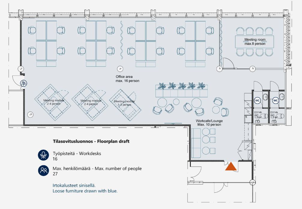 Hiljattain kokonaan remontoitu toimistotila 210,5 m2 Troolin D-rapussa. Tämän toimiston valoisaan monitilatoimistoon mahtuu kalustuksen toteutuksesta riippuen 10-27 työpistettä. Tilassa on 3 yhden hengen työhuonetta, tiimityötiloja ja neuvotteluhuone 8 hengelle. Toimiston keskiössä sijaitsevat tiimi- ja hiljaiset huoneet sekä lounge. Keittiö + taukotila sijaitsevat omassa rauhassaan, mutta keskeisellä paikalla. Lisäksi toimistossa on varasto/siivouskomero.
