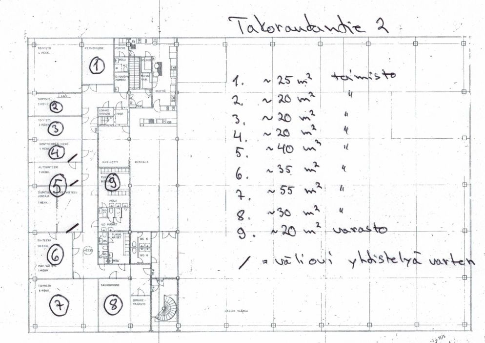 Kiinteistön 2. kerroksessa on pientoimistoalue. Vuokrattavat huoneet ovat 20 m² - 55 m² kokoisia. Osa huoneista on mahdollista yhdistää välioven avulla. Kuvat ovat yleiskuvia kiinteistön toimistotiloista.