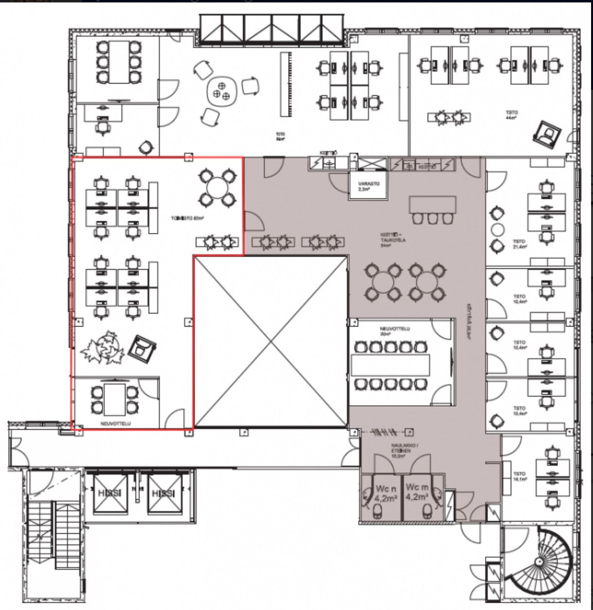 Vuokrataan 4. kerroksen 82 m2 toimistotila Mansku105:n toimistohotellista. Yhteiskäytössä muiden toimistohotellin vuokralaisten kanssa keittiö, wc:t ja lounge/taukotila.