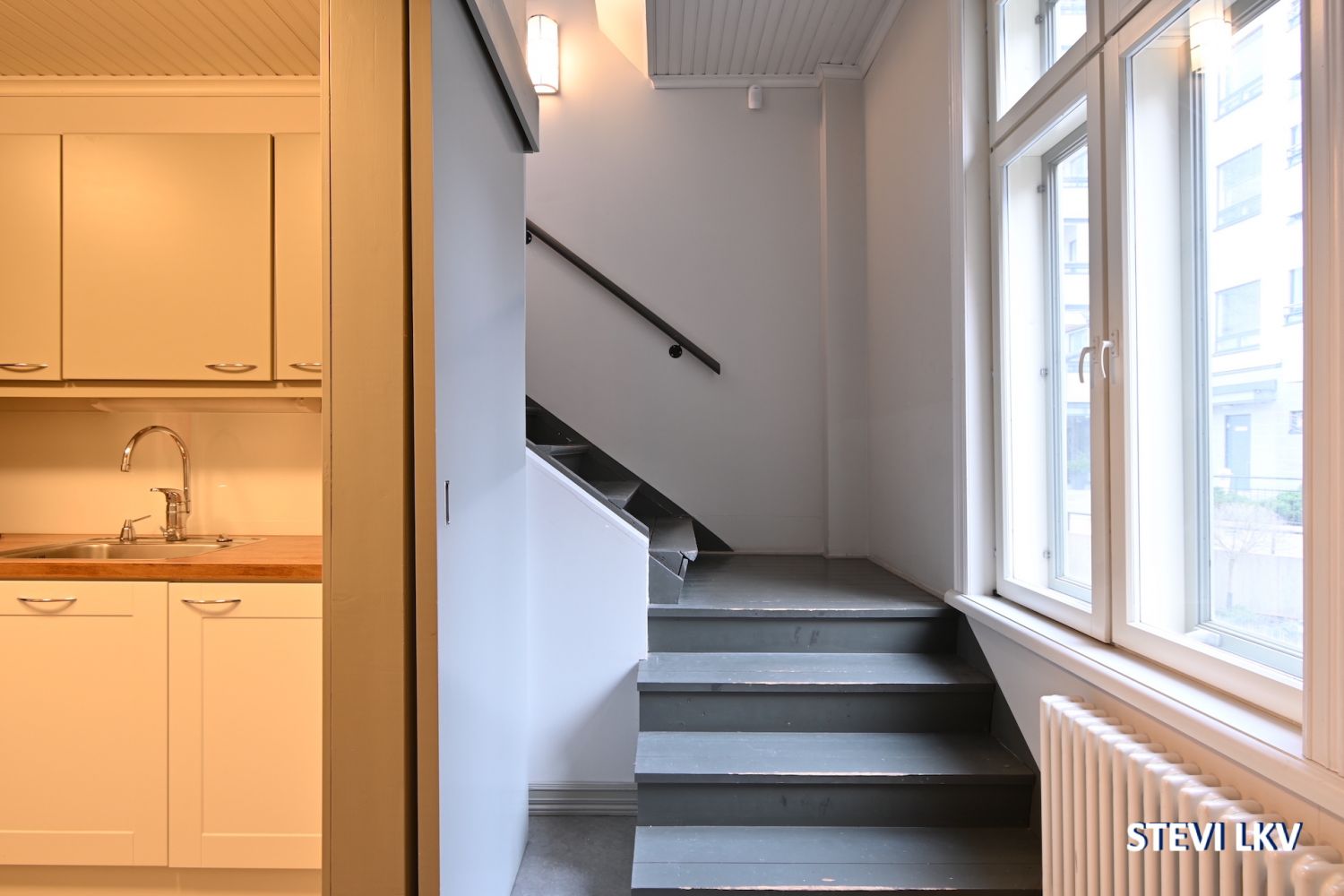 Avotilaa, yksittäisiä huoneita ja neukkareita. Korkeita huoneita. Lisäksi keittiöt, suihku & wc:t.