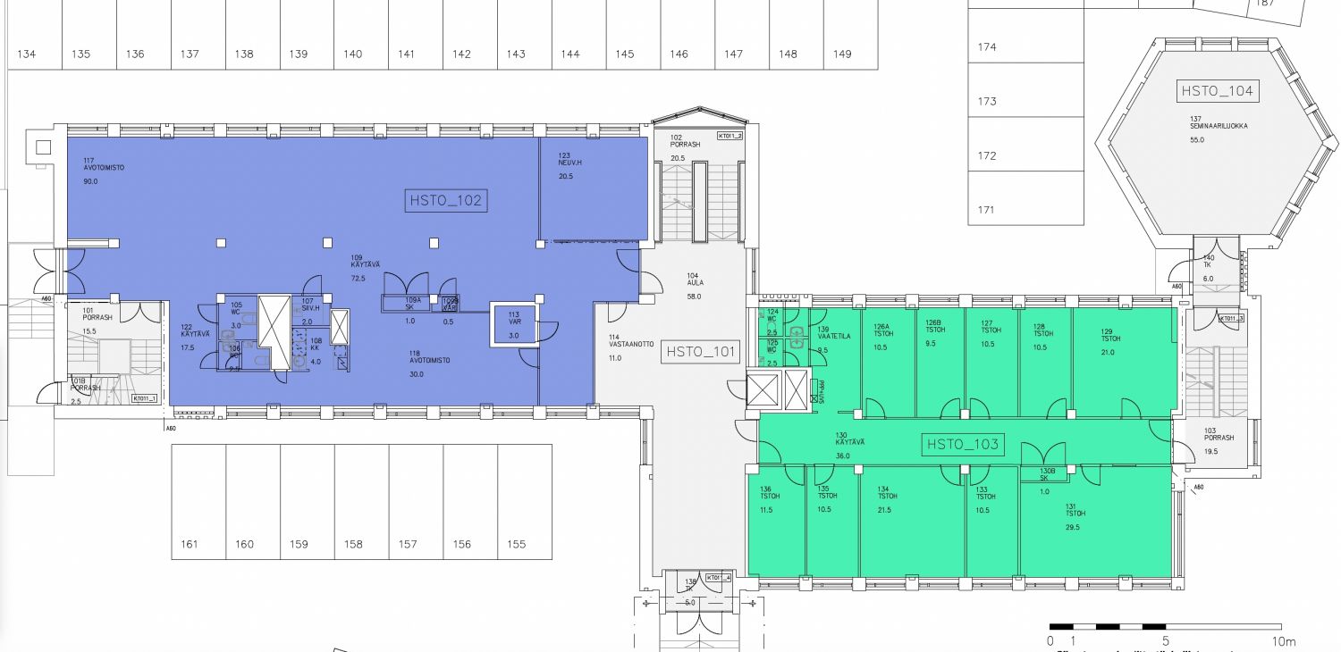 Toinen tiloista pääosin avotilaa ja toinen koostuu toimistohuoneista. Molemmissa tiloissa omat wc-tilat.