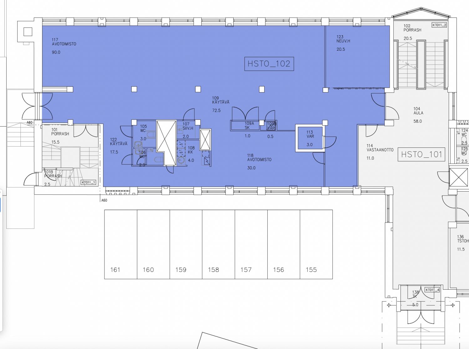 Ensimmäisen kerroksen avonainen toimitila Sakkaroosin tiilitalosta. Tilassa avotilan lisäksi toimistohuoneita, omat wc- tilat sekä keittiö.