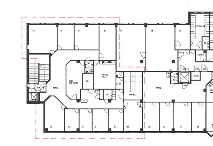 Nyt tilassa paljon huoneita, mutta tila on muokattavissa käyttäjän tarpeiden mukaiseksi. Useassa huoneessa vesipisteet.