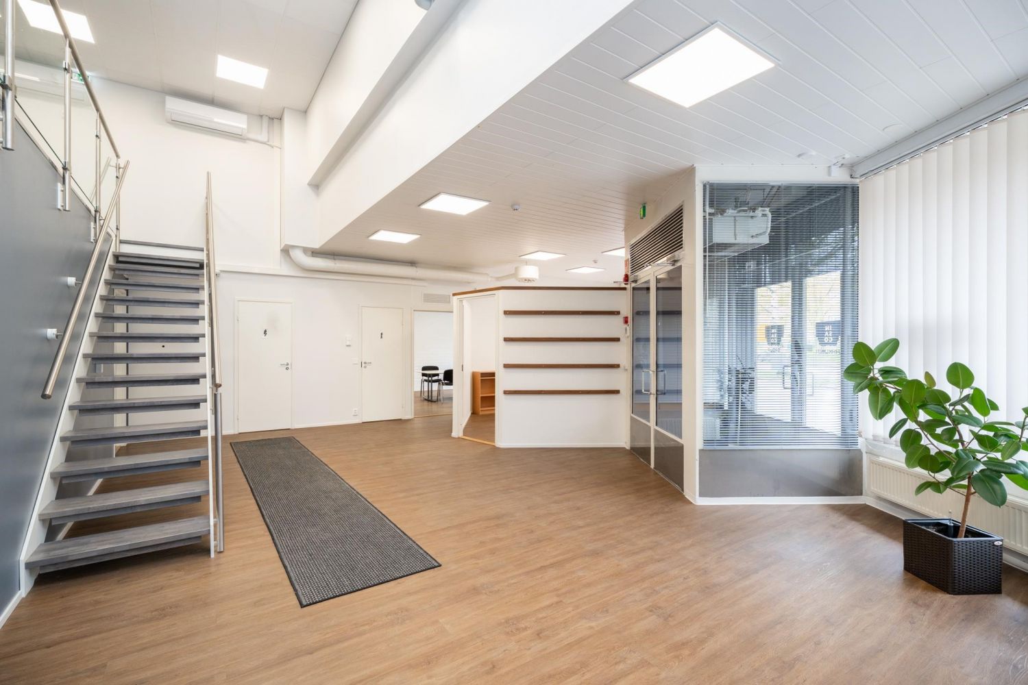 Toimistotiloja kahdessa kerroksessa jonka lisäksi tuotanto/varastotilaa isolla nosto-ovella sekä parvella. Tilassa oma ilmanvaihto, sähköinen kulunvalvonta, kameravalvonta, turvatila ja sähkölukot sekä ATK-verkko Cat6. 12 autopaikkaa kuuluu tälle liiketilalle.