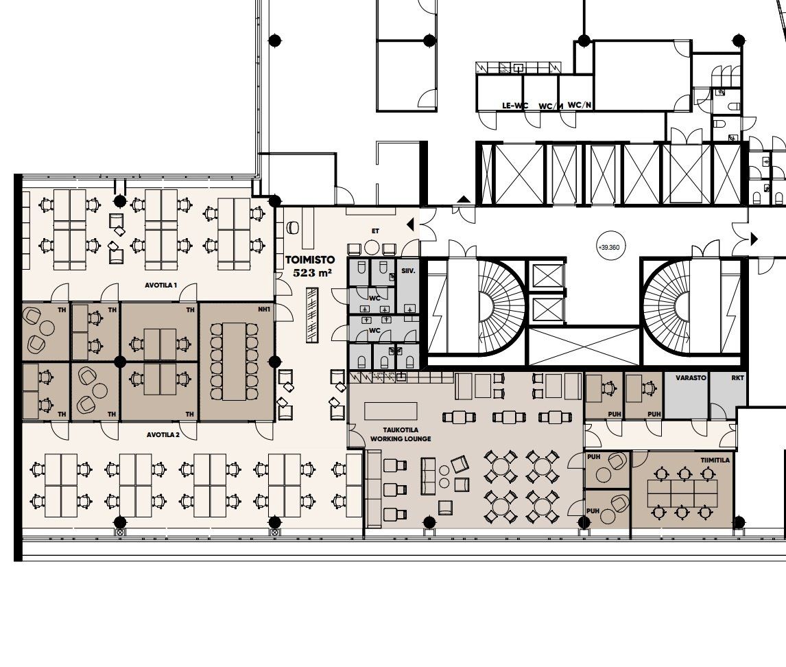 Ylimmän kerroksen valoisa ja tehokas toimisto. Tämä seitsemännen kerroksen toimisto koostuu avokonttorista sekä erikokoisista työtiloista ja neuvotteluhuoneesta. Oma keittiö ja wc:t sujuvoittavat päivän kulkua. Tila remontoidaan siistiksi.