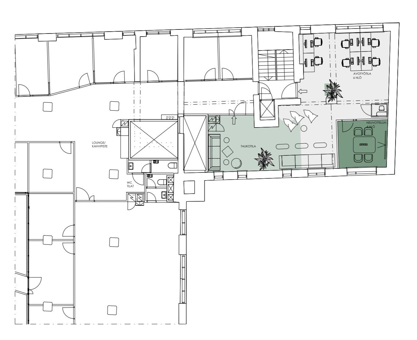 Pieni avokonttorista ja neuvotteluhuoneesta koostuva toimisto. Tätä kolmannen kerroksen tilaa palvelevat Fabrik Studiosin puolelta löytyvät keittiö ja sosiaalitilat. Käytössä on myös yhteiskäyttöinen neuvotteluhuone sekä WLAN-yhteys.