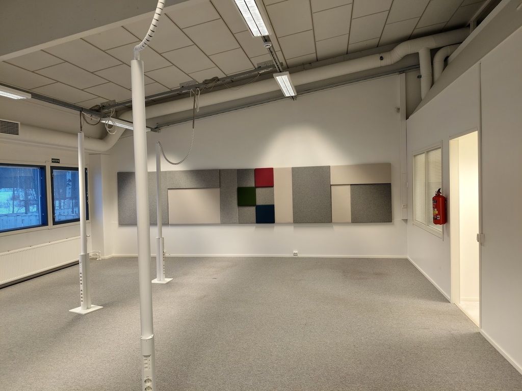 Tilan pinta-ala on yhteensä 293 m². Alakerrasta löytyy 220 m² ja 2. kerroksessa on neuvottelutilaa 30 m² ja avotilaa 20 m². Alakerrassa on keittiö ja yksi työhuone, jota voi käyttää myös pienempänä neuvotteluhuoneena. Koska tila on katutasossa, onnistuu isommankin tavaran tuonti helposti. Tila toimii loistavasti esimerkiksi showroomina, liikuntatilana tai ravintolana.