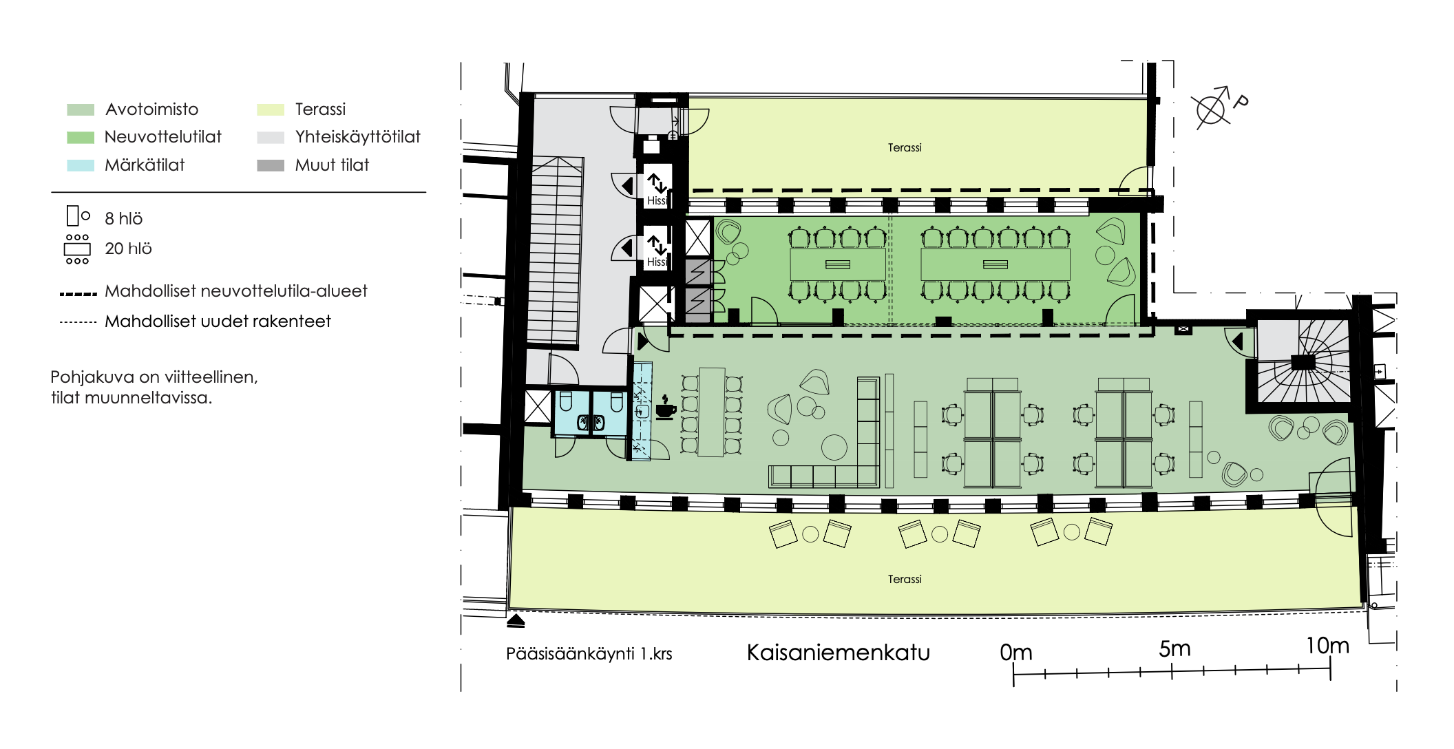 Ylimmän kerroksen tehokas toimistotila, jonka yhteydessä on myös iso terassi. Kiinteistö on tällä hetkellä putkiremontissa, tämän yhteydessä uusitaan samalla kaikkien tilojen wc-pinnat sekä kalusteet.