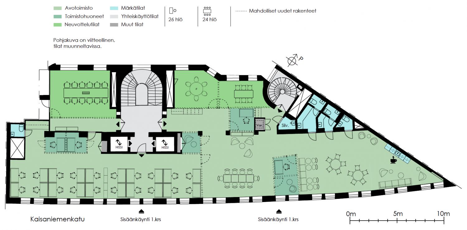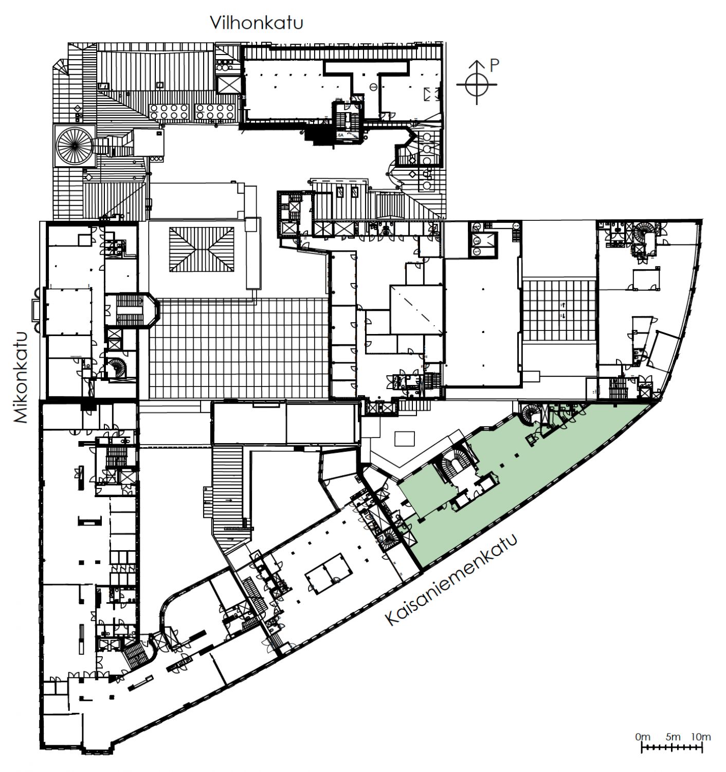 Runsaasti tilaa toteuttaa käyttötakoitukseen sopiva toimisto. Näkymät Kaisaniemenkadulle ja sisäpihalle. Neljä sisäänkäyntiä. Tilaan tehdään pintaremontti toiveiden ja käyttötakoituksen mukaan. Kiinteistössä on tehty putkiremontti vuoden 2025 aikana ja tämän yhteydessä uusittiin samalla kaikkien tilojen wc-pinnat sekä kalusteet.