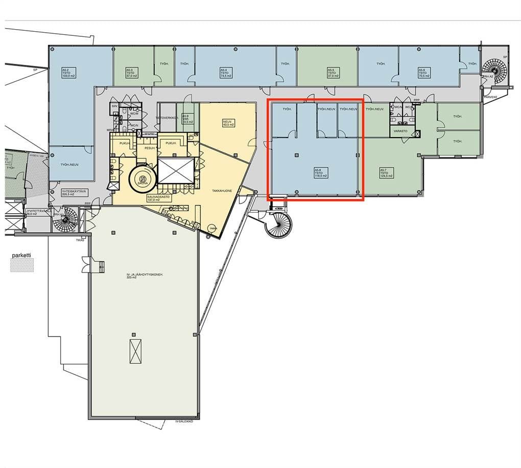 Tämä viidennessä kerroksessa sijaitseva toimistotila koostuu avotoimistosta sekä kolmesta erillisestä työhuoneesta, jotka soveltuvat sekä rauhalliseen työskentelyyn että neuvottelutiloiksi. Lisäksi tilan käyttäjillä on mahdollisuus järjestää tilaisuuksia samassa kerroksessa sijaitsevassa Huudin saunatilassa ja suuremmissa neuvotteluhuoneissa. Yhteiskäytössä olevat wc-tilat sijaitsevat kätevästi aivan toimiston vieressä.