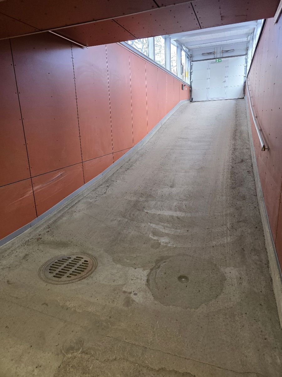Tilaan kulku rappukäytävästä kerros maanalle tai autoliuskaa pitkin autohalliin.