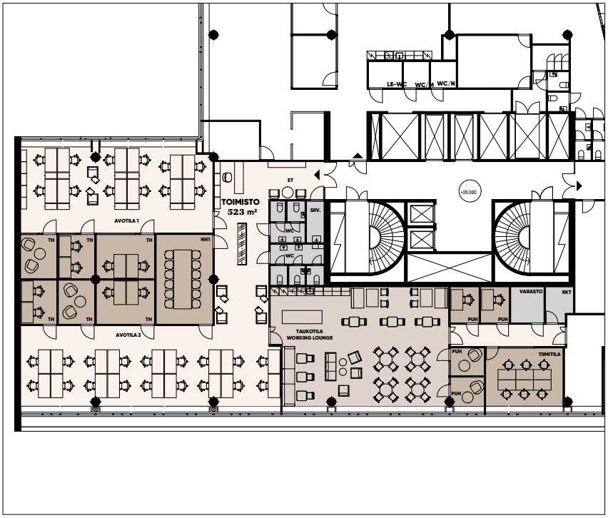 Ylimmän kerroksen tehotoimisto, joka tukee monipuolisesti työntekoa. Tila remontoidaan siistiin toimistotasoon.