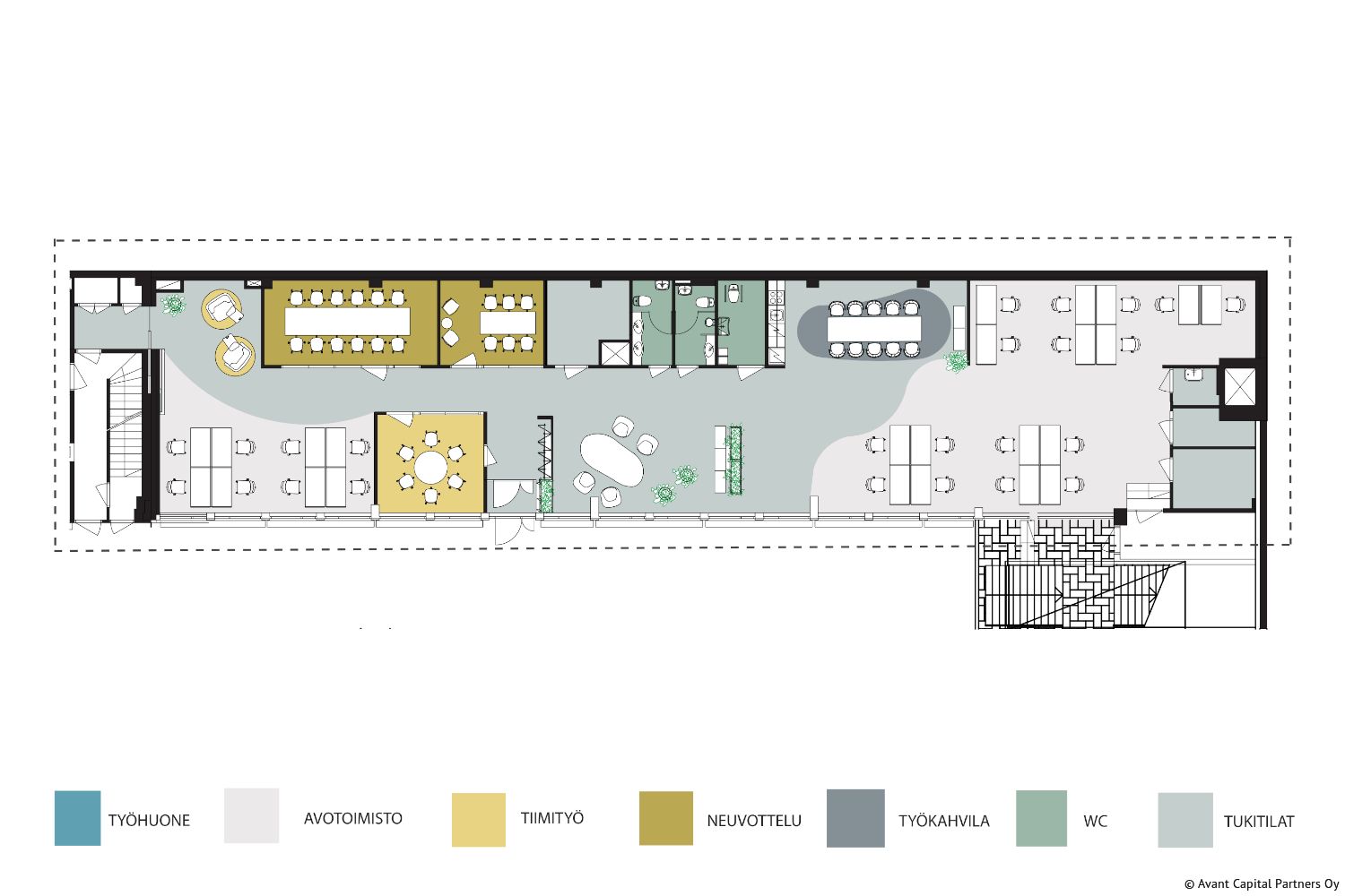 Tilan ominaisuudet: tilassa on ilmastointi, avo-/kombitoimisto