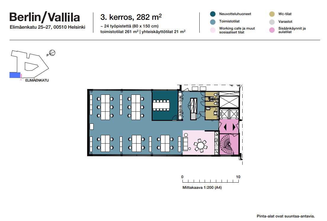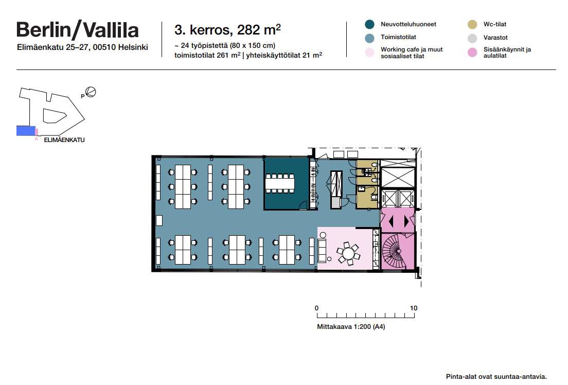 Berlin/Vallilan uudemman osan 282 m² toimistossa on ikkunat kahteen suuntaan, sekä kadulle että sisäpihalle. Selkeänmallinen tila, joka tehokkaasti hyödynnettävissä.