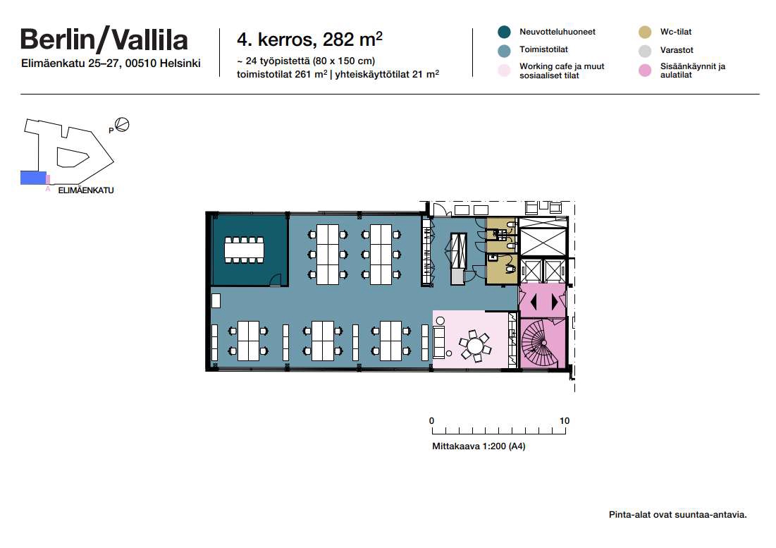 Berlin/Vallilan uudemman osan 282 m² toimistossa on ikkunat kahteen suuntaan, sekä kadulle että sisäpihalle. Selkeänmallinen tila, joka tehokkaasti hyödynnettävissä.