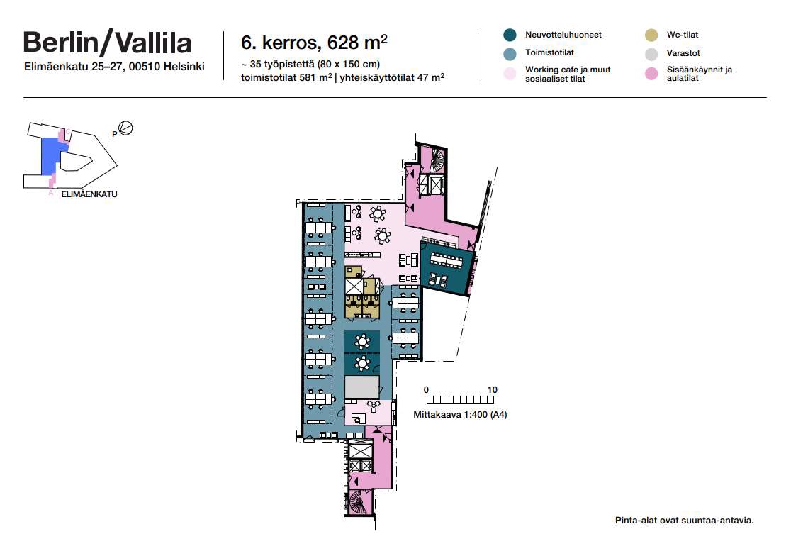 Berlin/Vallilan ylimmän kerroksen 628 m² tila sijaitsee kiinteistön uudemmalla puolella. Tila on purettu betonille, mahdollistaen sen räätälöinnin ja tilankäytön suunnittelun vuokralaisen toiveiden ja tarpeiden mukaan.
