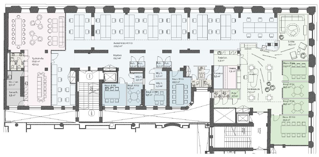 Erittäin hieno ja edustava kiinteistö, jossa vapaana 678 m² toimisto toisesta kerroksesta. Talon tilat koostuvat arvokiinteistölle tunnusomaisesti suurehkoista huoneista ja ovat korkeat sekä valoisat. Tämä tila on jaettu vielä tiiviimmin työhuoneisiin, jotka ovat kuitenkin purettavissa avaten tilaa laajempiin vyöhykkeisiin. Tila sijaitsee kiinteistön kulmassa ja jatkuu Keskuskadun puoleiseen osaan.