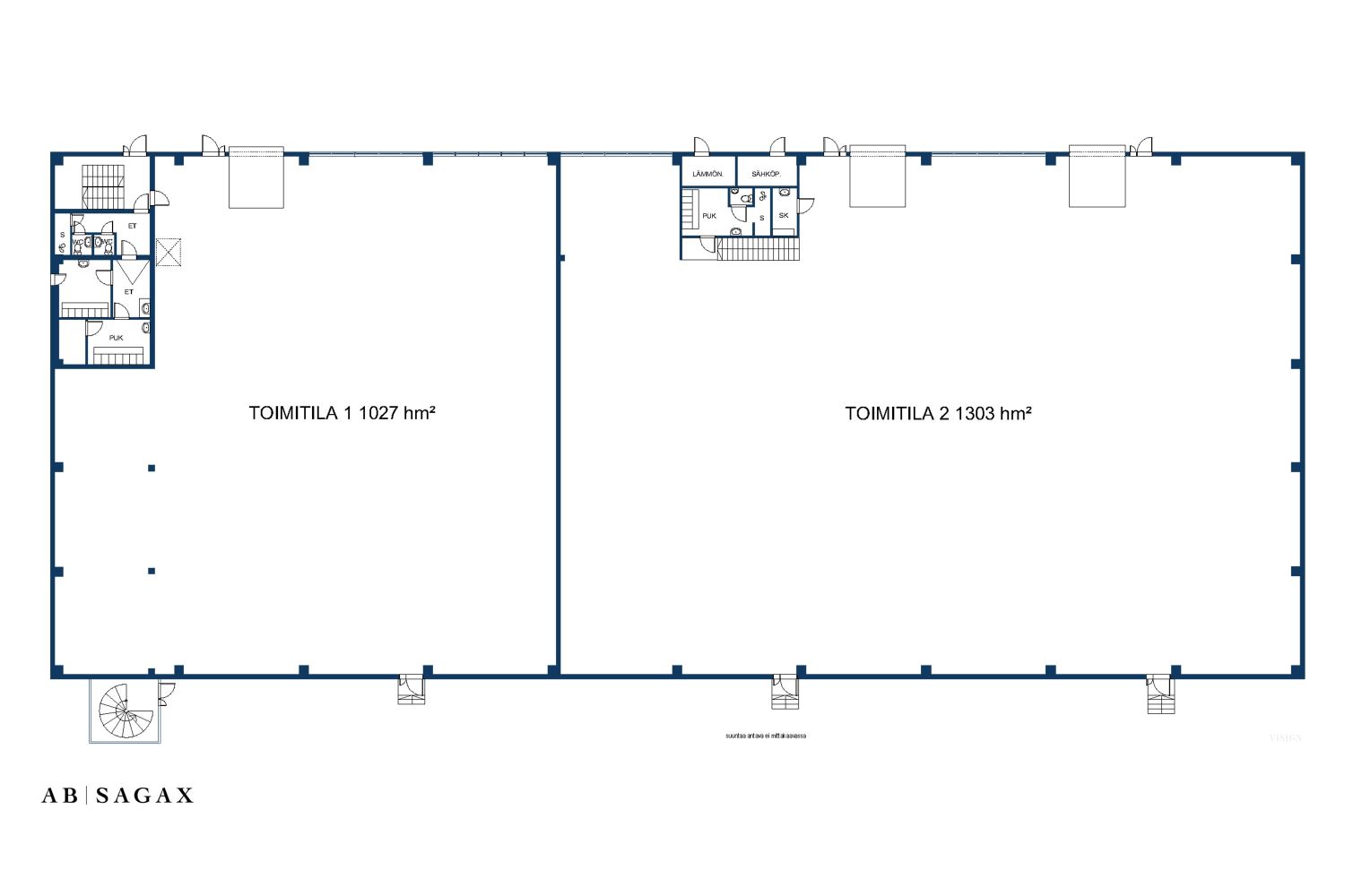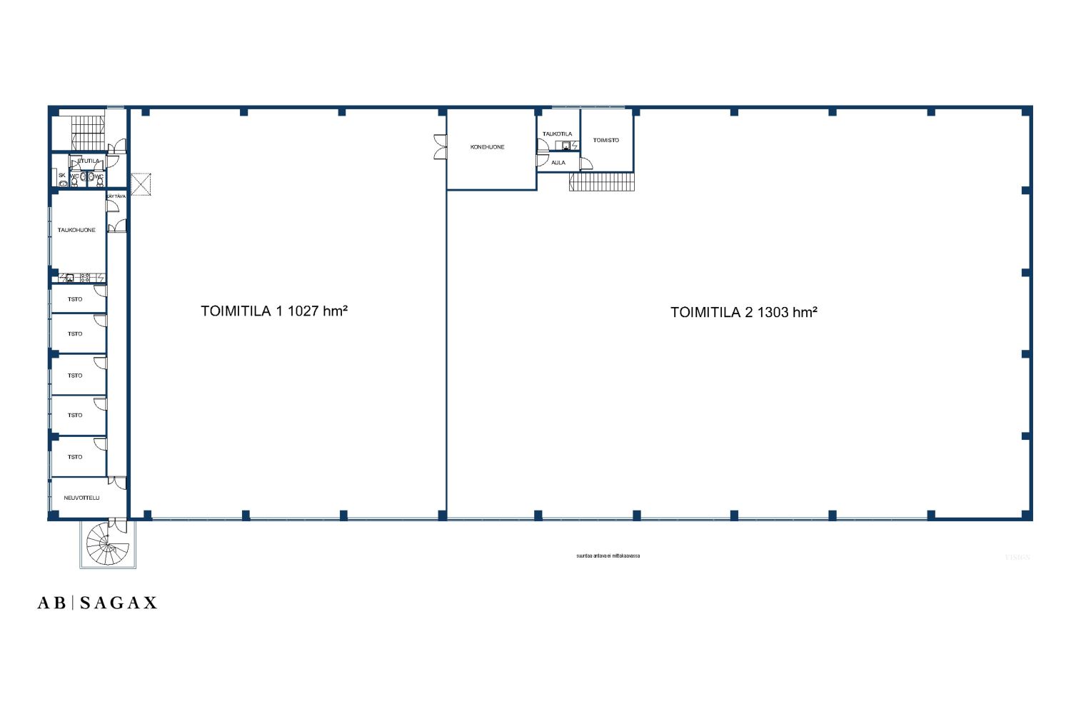 Jaettavissa 1023m2 ja 1303 m2 kokoisiksi tiloiksi.