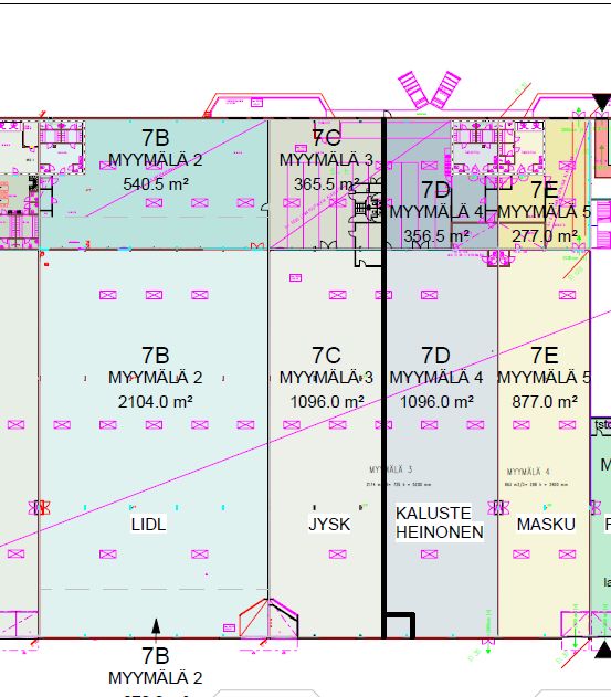 Isompi kokonaisuus jaettavissa neljään eri liiketilaan: 200 m², 285 m², 520 m², 555 m², tai näistä jokin yhdistelmä.