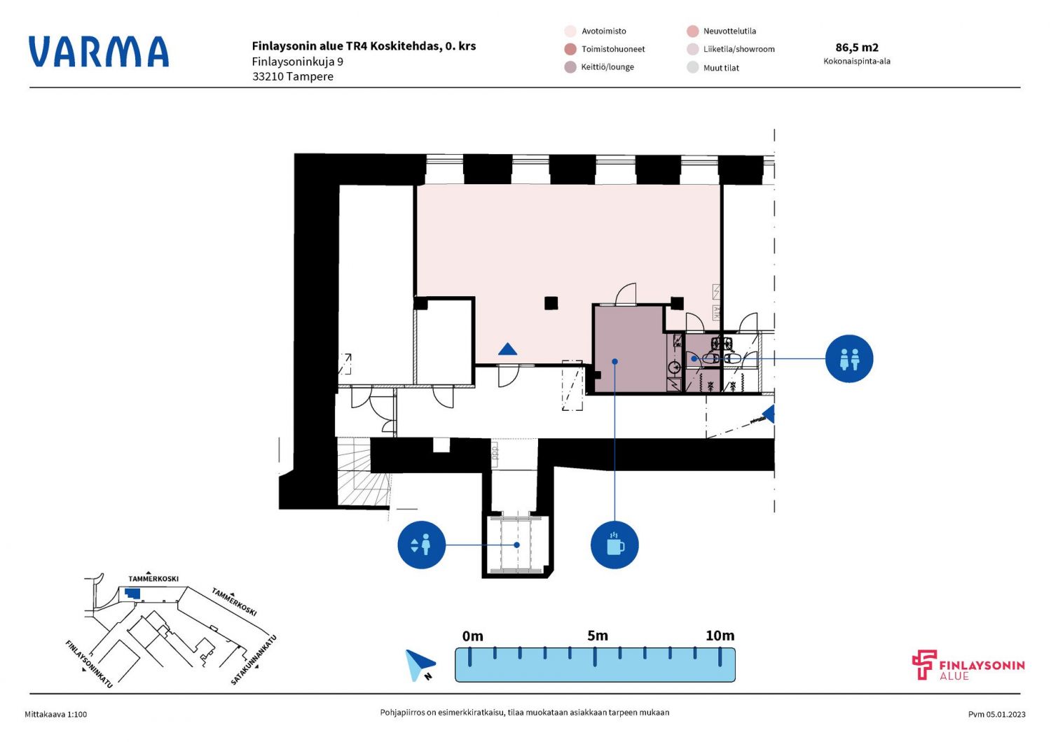 Perinteikäs Finlaysonin alue on vireä liike-elämän, vapaa-ajan ja kulttuuritapahtumien keskus, jossa toimivissa yli 100 yrityksessä työskentelee ja asioi päivittäin tuhansia ihmisiä. Alueen useat ravintolat ja kahvilat mahdollistavat maukkaat lounas- ja kahvihetket. Finlaysonin alueen vanhat tehdasrakennukset tarjoavat yrityksellesi uniikin toimintaympäristön Tammerkosken maisemissa. Finlaysonin alue on helposti saavutettavissa omalla autolla, julkisin kulkuvälinein ja kevyellä liikenteellä. Keskustori ja rautatieasema ovat kävelymatkan etäisyydellä. Avotoimistotila koskinäkymin osoitteessa Finlaysoninkuja 9.