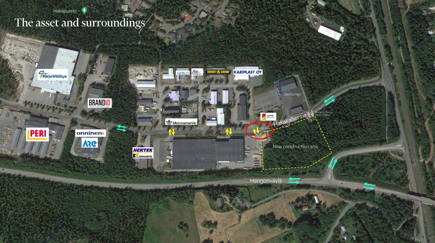 Kohde sijaitsee loistopaikalla Hyvinkään eteläosassa Hakalassa, joten siitä on hyvä ajoyhteys niin Tampereelle, kuin pääkaupunkiseudulle. Sijainnin loistavuutta korostaa muutaman minuutin ajomatka Hangonväylän liittymään, sekä vain 5,7km etäisyys Tampereen valtatieltä. Kohteeseen pääsee siis autolla joka suunnasta; esimerkiksi noin 26 minuutin ajomatka Kehä III:lta.