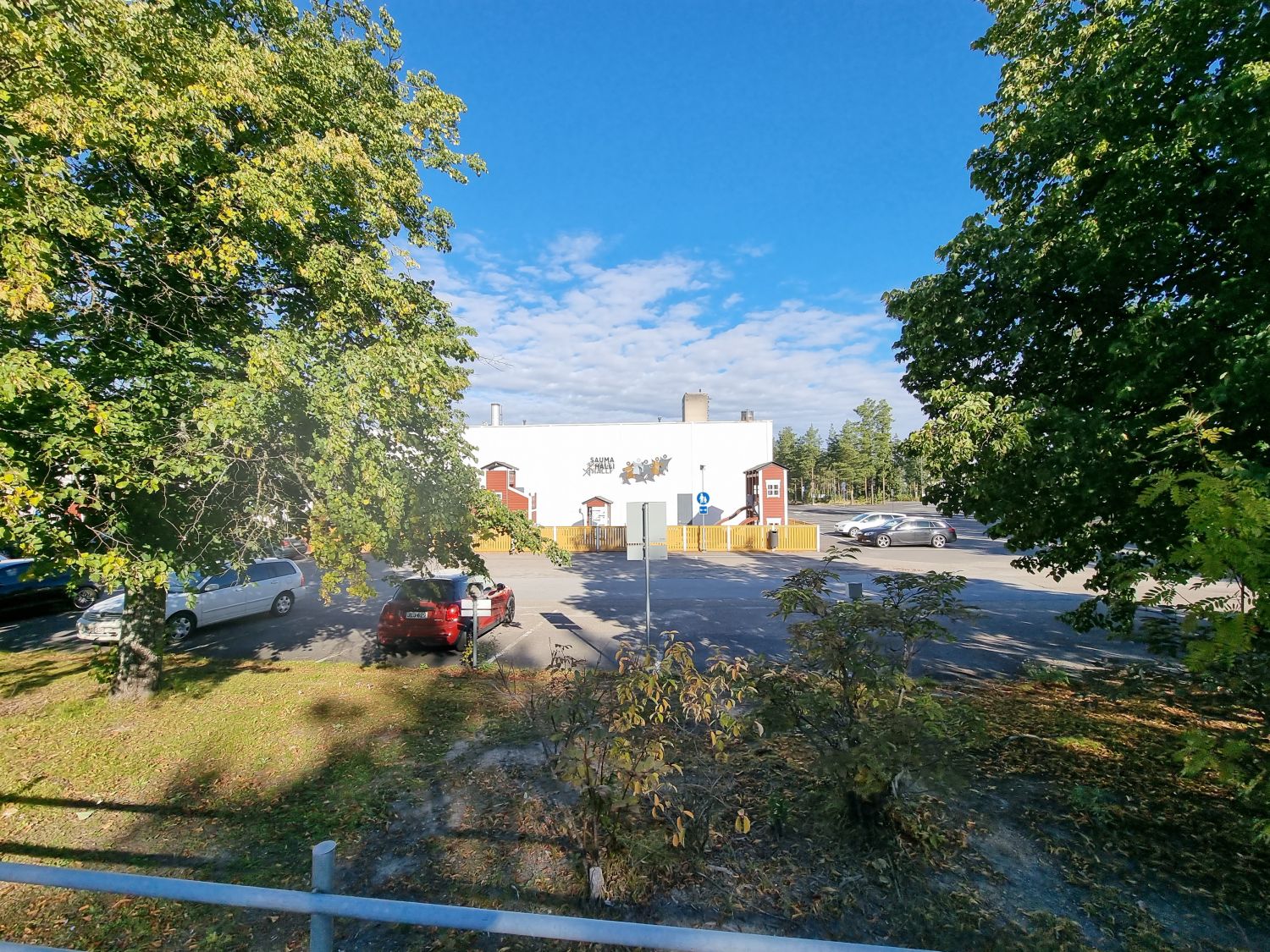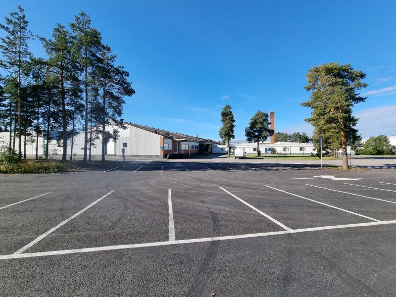 Asfaltoidulla pihalla paljon parkkipaikkoja.