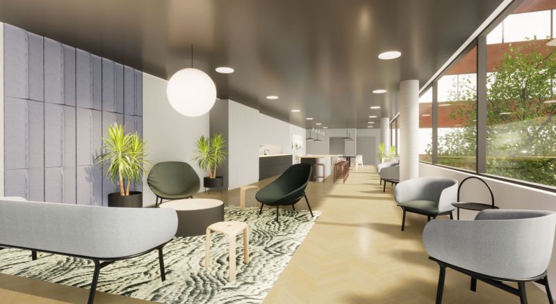 Kiinteistössä aulavastaanotto, erillisiä neuvotteluhuoneita, ravintola, kuntosali, ym.