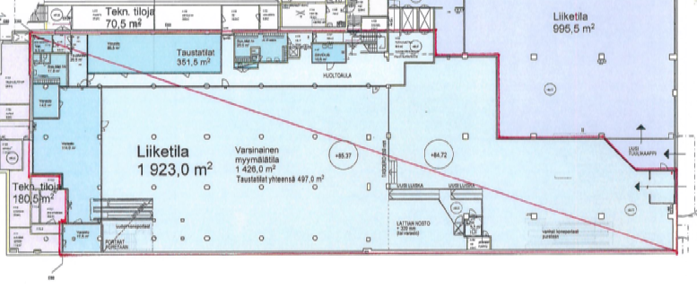Katutason alapuolella varsinaista liike - / myymälätilaa on n. 1426 m2, jonne liukuportaat katutasosta. Tausta- ja varastotilaa n. pohjakerroksessa n. 497m2 (ks. pohjakuva). Tilat voidaan vuokrata yhdessä ja erikseen, ja niitä voidaan myös lohkoa pienempiin osiin. Myös katutasossa vapaina n. 390 - 410 m2-kokoisia liiketiloja, kysy lisätietoja!