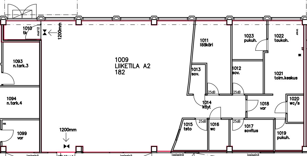 168 m2, tällä hetkellä iso eteistila, neljä toimistohuonetta, keittiö, neukkari, 2 x wc.