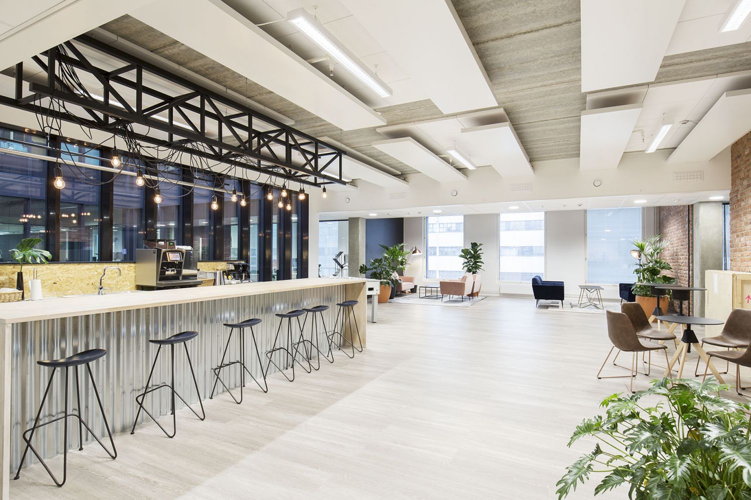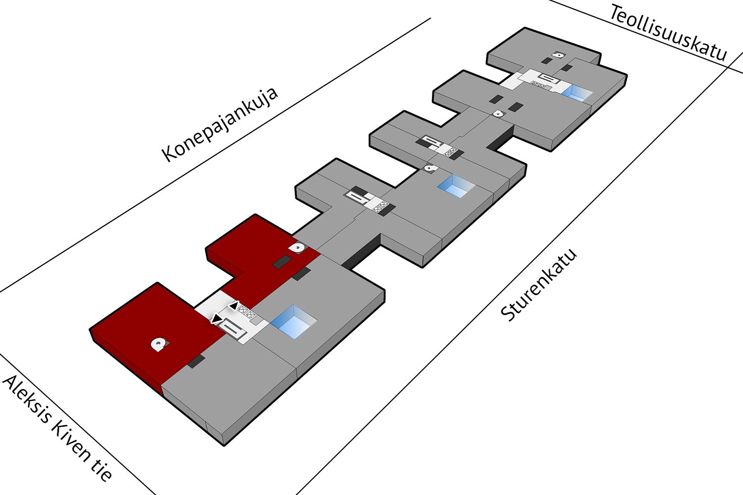 Tämä suuri, valoisa ja moderni viidennen kerroksen toimitila koostuu kahdesta hissiaulan yhdistämästä noin 400 m² osasta. Toimistossa on avotilaa ja muutamia eri kokoisia neuvotteluhuoneita sekä keittiö- ja wc-tilat. Ikkunoista on näkymät Aleksis Kiven kadun ja sisäpihalle Konepajan suuntaan.