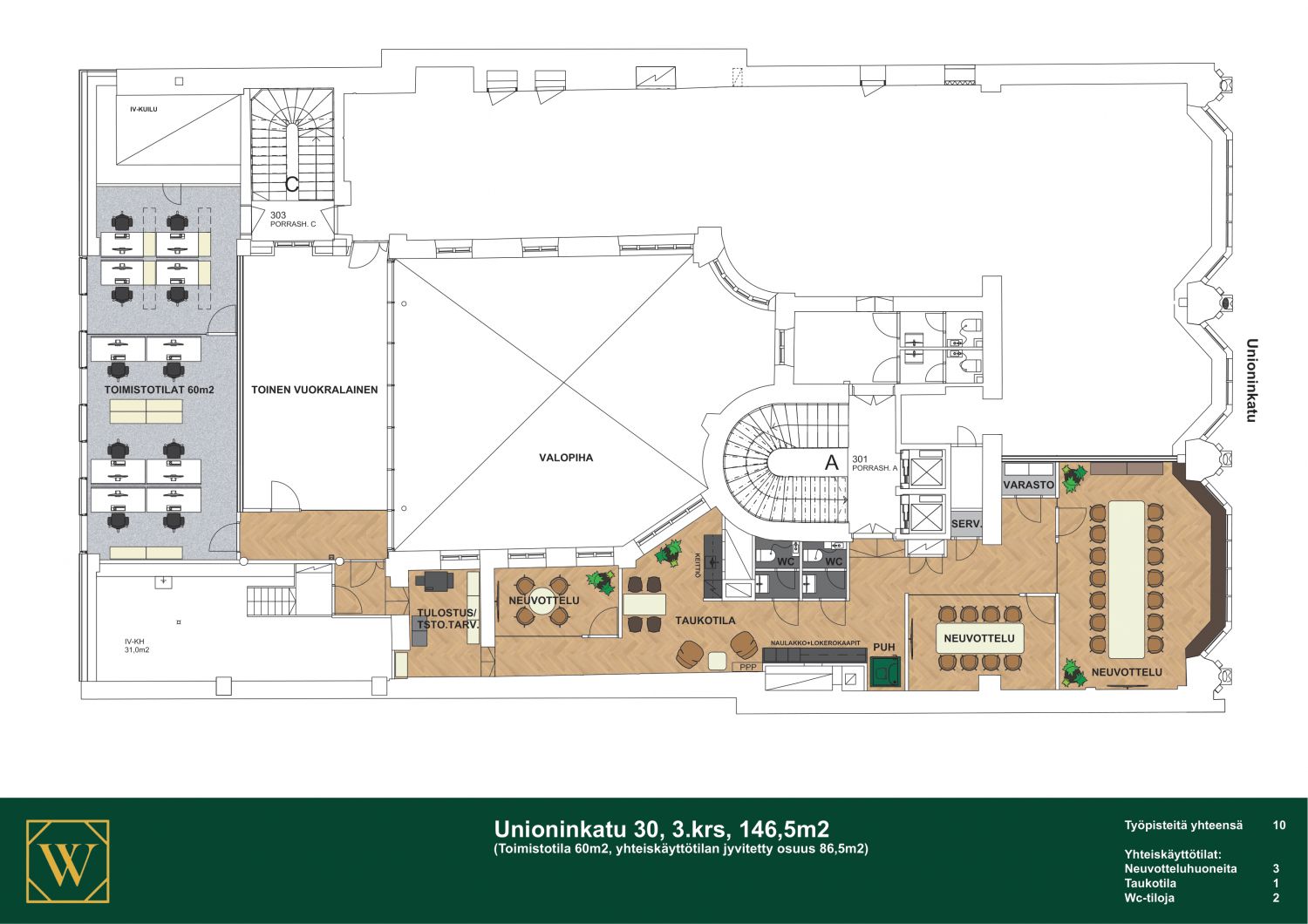 Tämä vuokrattava tila sisältää 60 m2 oman toimiston sekä toisen vuokralaisen kanssa jaettavat kalustetut yhteiskäyttötilat, joista jyvitetty osuus on 86,50 m2. Hulppeissa yhteiskäyttötiloissa on iso, 12 hengen neuvotteluhuone, pienempi 6 hengen neuvotteluhuone, erillinen hiljaisen työn huone, keittiö ja wc:t. Tiloista aukeaa hurmaavat näkymät Torikortteleille ja Tuomiokirkolle päin.
