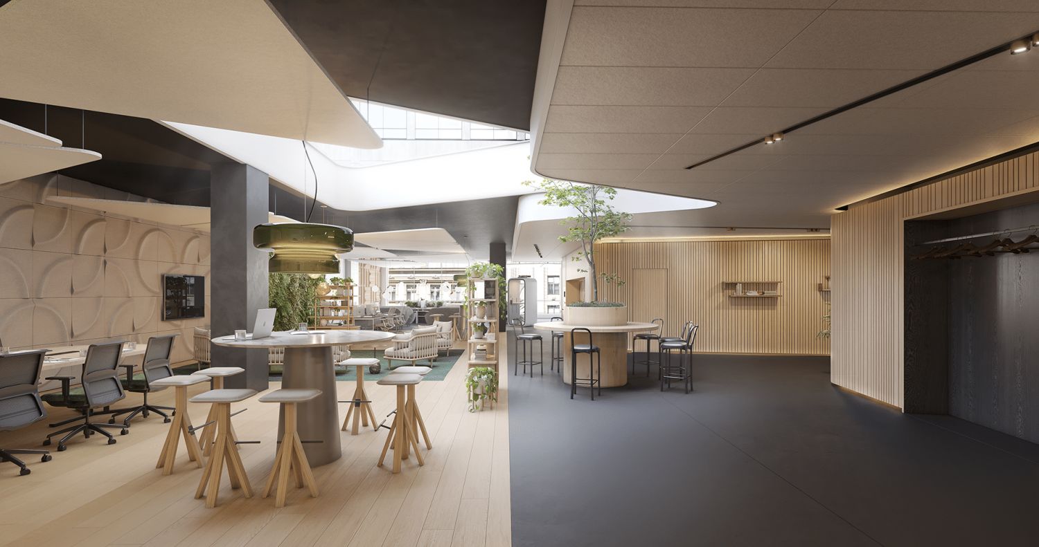 Sisäpihan puolelta tila on maan tasossa ja siten toiminnallisesti yhdistettävissä Gasellikorttelin monipuoliseen ravintolamaailmaan. Tämä mahdollistaa myös julkisen working cafe:n toteuttamisen.