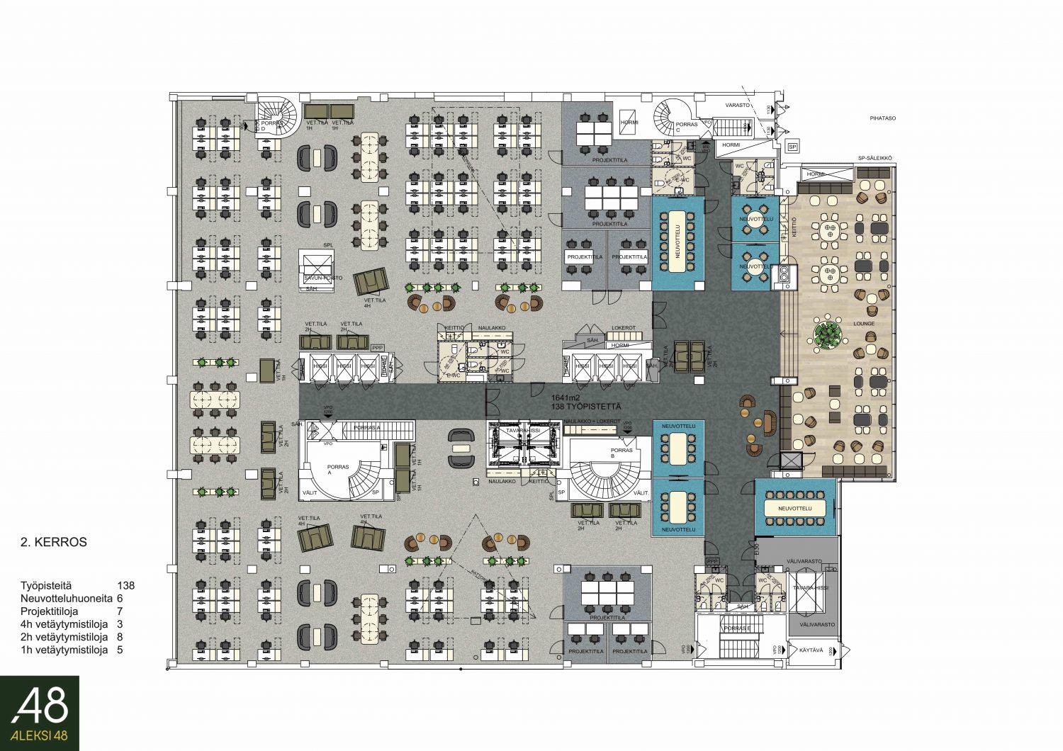 Aleksi 48:n toinen kerros on aiemmin liiketilakäytössä toiminut noin 1650 m² suuruinen tilakokonaisuus. Nyt se remontoidaan toimistotilaksi.