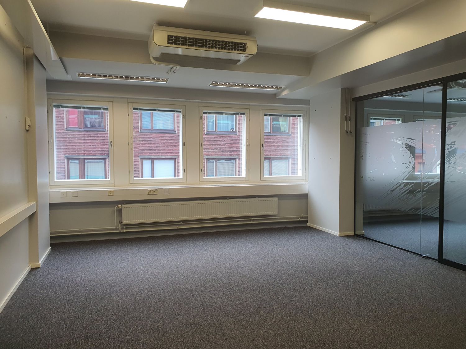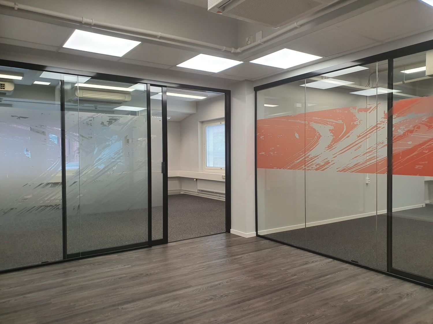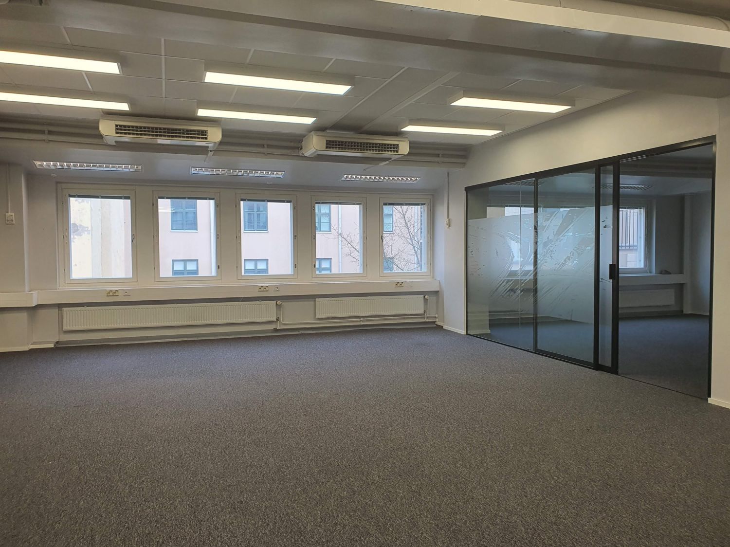 Tämä kustannustehokas 5. kerroksen toimistotila taipuu moneen. Tilakokonaisuuteen kuuluu erikokoisia huoneita lasiseinin ja ilman. Taukokeittiö sekä avokeittiö saarekkeella, 4 WC-tilaa ja pari erillistä suihkua pukeutumistiloilla.