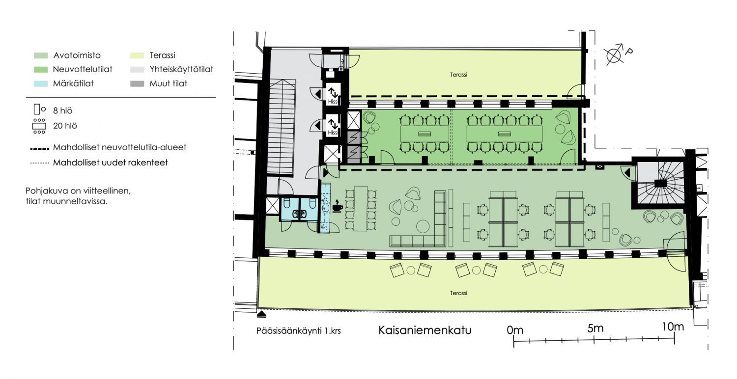 7. krs 386m2 ja 8.krs terassillinen 176m2 toimisto, jotka voidaan yhdistää 562m2 kokonaisuudeksi. Kiinteistössä on tehty putkiremontti vuoden 2025 aikana ja tämän yhteydessä uusittiin samalla kaikkien tilojen wc-pinnat sekä kalusteet.