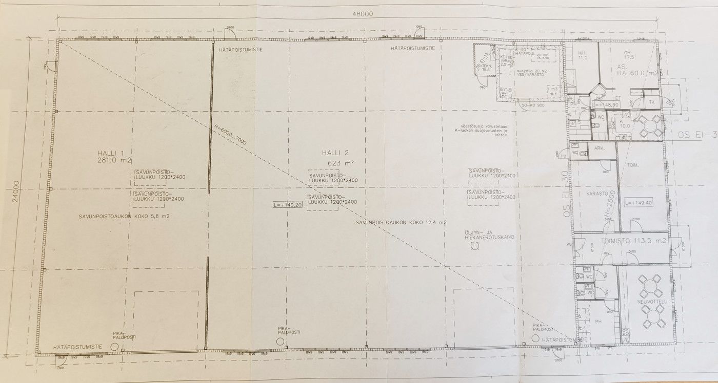 Kiinteistö koostuu 7 metriä korkeasta hallitilasta joka on jaettu kevyellä väliseinällä. Aiemmin pienempi tila on toiminut maalaamona. Maalaamon puolella on myös öljynerotuskaivo. Hallin yhteydessä on 140 m2 toimisto- ja sosiaalitilat sekä täysin erillinen asuinkaksio joka on tällä hetkellä vuokrattuna.