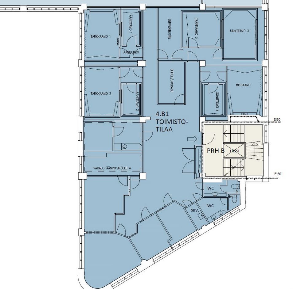 Tehokas huonekonttori 4. kerroksessa. Toimiston aiemman käyttötarkoituksen mukaan soveltunut puheen äänitysstudiotoimintaan. Tila sijaitsee hissillisessä B-rapussa 4. kerroksessa.