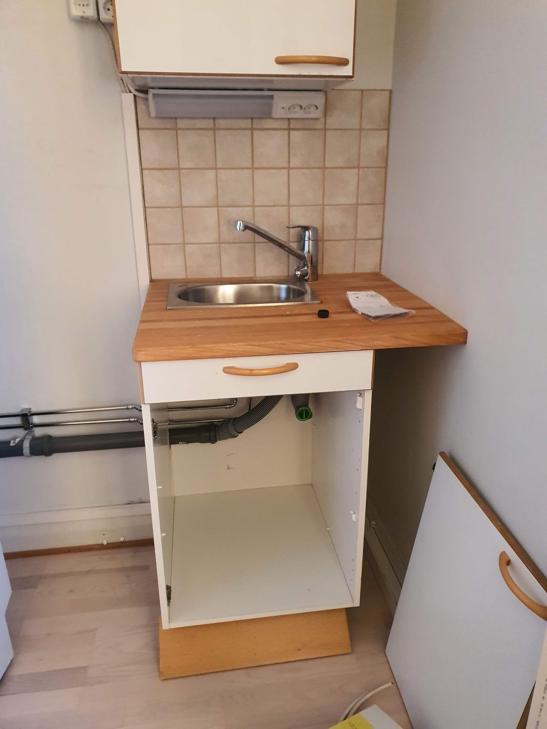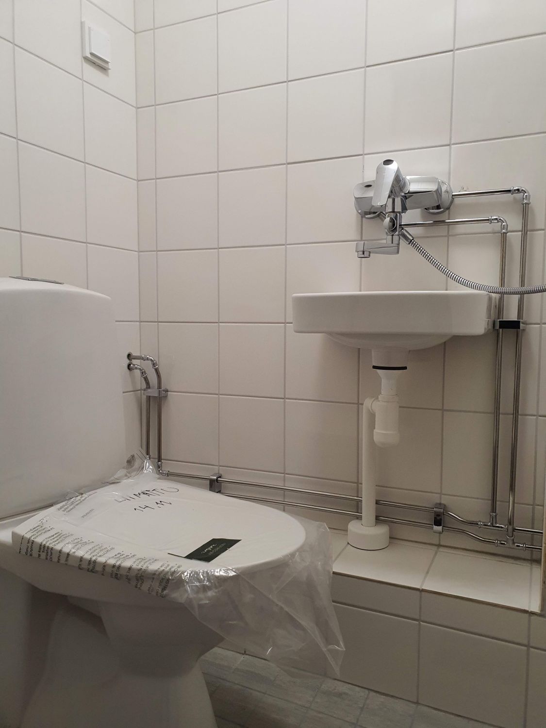 Tilassa wc/suihku, keittiökulmaus, pieni eteinen ja avotilaa.