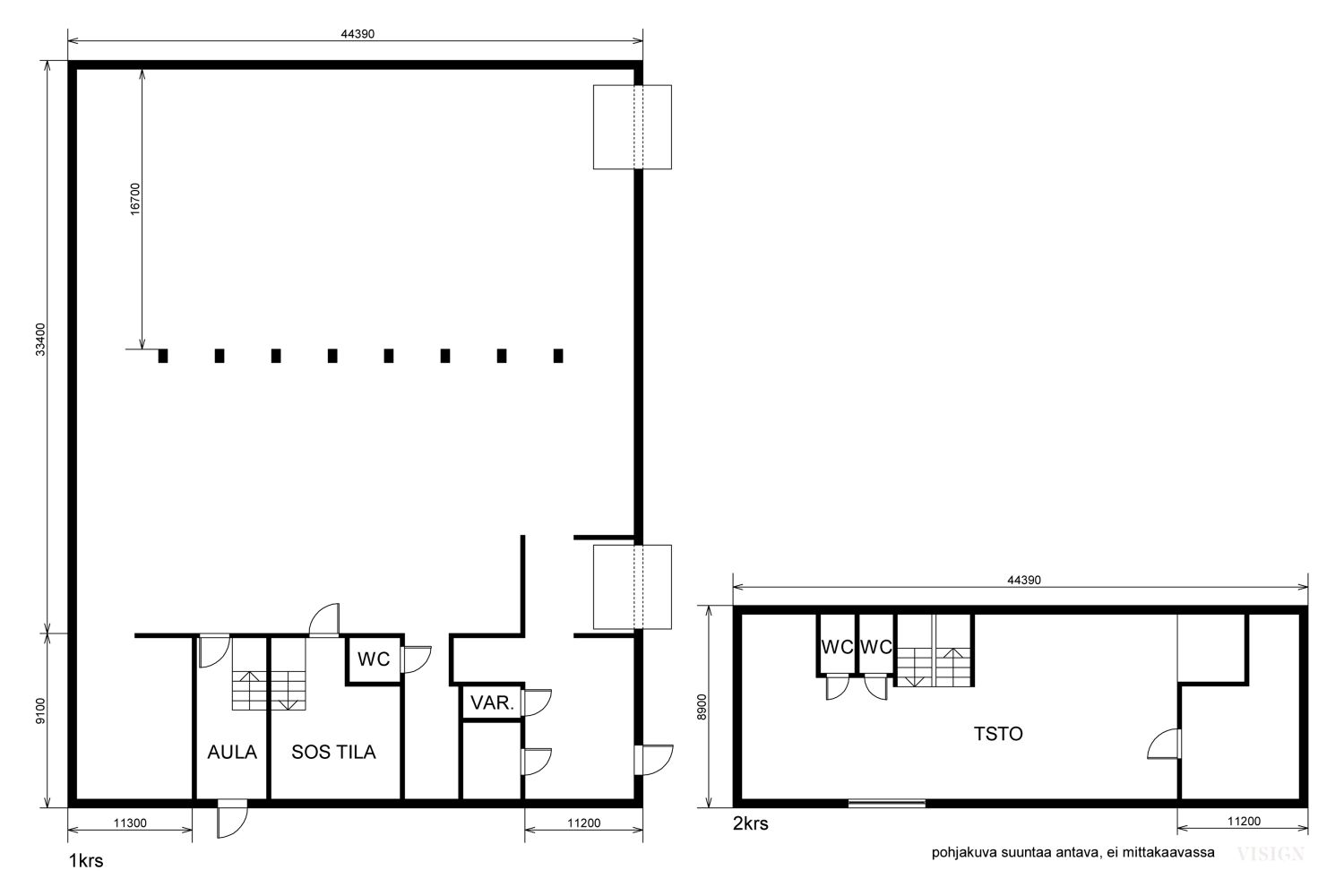 Hallissa 2 nosto-ovea noin 4.3x4.2, toinen lastauslaituri, toinen ovi sisään asettava. Hallin koko n.1500m2 ja korkeus n.4.4m.
